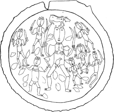 Рис. 31. Изображения шаманов на серебряном ковше из Коцкого городка, низовье Оби, 1Х-Х вв. Гос. Эрмитаж.
