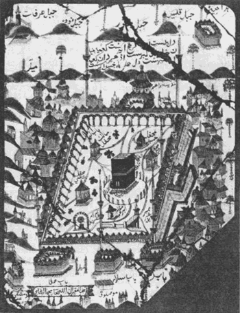 Средневековые мусульмане чтили много святых мест, куда ходили на поклонение. Но самым главным было паломничество (хадж) в Мекку – древнюю религиозную святыню арабских племен (рис. 42). Хотя бы один раз в жизни каждому правоверному предписывалось посетить Каабу – святилище, к которому обращены михрабы (молитвенные ниши) мечетей мира. Из всех стран ислама – от Марокко и Алжира до Зондских островов, от Булгара и Средней Азии до Йемена – миллионы паломников (хаджи) пешком и на быстрых верблюдах приходили к «дому святому». Верили, что «черный камень» Каабы дарует исцеление больным и очищает от грехов.
