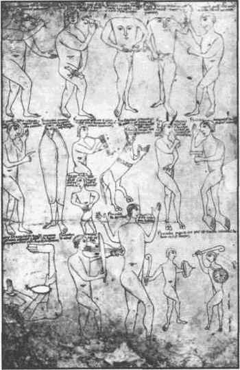 Рис. 6. Легенды о человекообразных монстрах, живущих на краю света, давали пищу для воображения средневековых мастеров. Германская рукопись второй половины XII в.