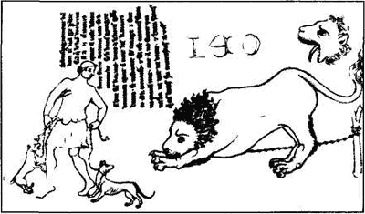 «Лев. Я хочу рассказать вам о дрессировке льва. Тот, кто дрессирует льва, имеет двух собак Когда он хочет заставить льва что-либо выполнить, он ему приказывает. Если лев рычит, укротитель бьет своих собак. Когда лев видит, как бьют собак, на него нападает великий страх. Его смелость пропадает, и он делает все, что ему приказывают. Я не говорю о тех случаях, когда лев взбешен, так как тогда он не подчиняется ничьей воле и не сделает ни хорошего, ни дурного И знайте, этот лев нарисован с натуры». [191]
