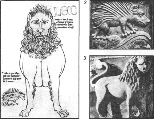 Рис. 48. Альбом Виллара де Оннекура Готическая скульптура 1 – лев и дикобраз (рисунок), 2 – фрагмент деревянной резьбы капеллы собора в Эвре, XV в, 3 – капитель собора в Невере XII в. [193]