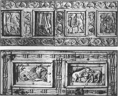 Рис. 49. Владимирские резчики по камню нередко копировали экзотические существа на костяных пластинках византийских ларцов, привозимых на Русь. На рисунке представлены пластины византийских шкатулок XII в.