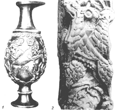 Рис. 57. Львы 1 – иранский серебряный кувшин, VI– VIII вв. Национальная библиотека, Париж; 2 – изваяния на столбе в Муассаке, Лангедок, XII в.