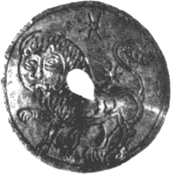 Рис. 58. Лев и солнце. Медная позолоченная бляшка из Новгорода XII в. Новгородский историке – архитектурный музей – заповедник