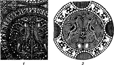 Рис. 59. Птицы: 1 – византийская ткань, XI– XII вв.; 2 – роспись смоленской церкви XII в. по мотивам византийского текстиля.
