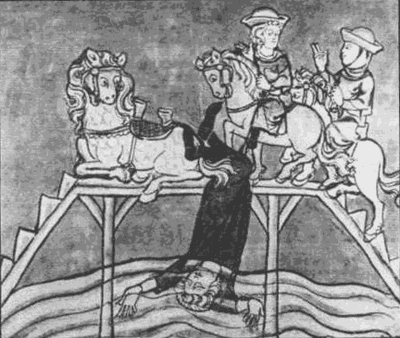 Рис. 10. Илья Муромец. М.-Л., 1958. С. 32. Падение всадника со свайного моста. Миниатюра из рукописи 1330 г. Национальная библиотека, Париж.
