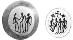 Рис. 15. Геммы-амулеты с изображением трех волхвов – покровителей путников (IX– X вв.): 1 – из раскопок в Смоленске, 2 из Ливерена (Нидерланды)
