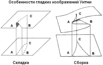Так вот, Уитни заметил, а несколько позже и доказал (это было исключительно сложно!), что проекции на плоскость всех типов помятостей, при условии что целостность листа не нарушена (т. е. на нем нет разрывов и дырок), могут быть сведены к двум типам, названными «складкой» (fold) и «сборкой»(cusp). Более того, «складка» и «сборка» два наиболее устойчивых типа «помятостей». Могут быть и другие типы, но они легко нарушаются при незначительных шевелениях поверхности или направлениях проектирования на плоскость.