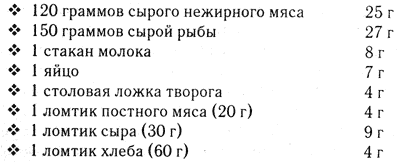 Совершив это несложный расчёт, мы сосчитали количество так называемого чистого белка. Однако продукты питания состоят из разных компонентов и не все из них богаты белком. Даже в мясе его содержится лишь около 15 %. Поэтому, чтобы высчитанное нами количество белка «перевести» в продукты питания, нужно обратиться к таблице. В ней приведены цифры примерного содержания белка в наиболее распространённых продуктах.