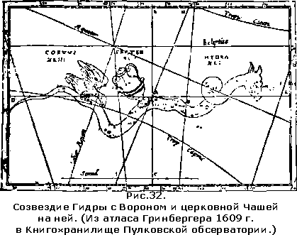 Иоанн увидел ее символ со своего пустынного патмосского берега в фигурах облаков над греческим архипелагом, напоминающих своим видом женщину, сидевшую на багряном семиголовом облаке-звере, с десятью рогами, внутри которого был символ богохульства (созвездие Самка Гидры, носящая на своей спине церковную Чашу, рис. 32).