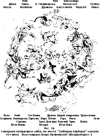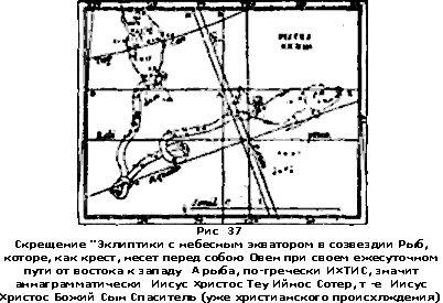В том же месте неба мы видим и символ его грядущего воскресенья — звездного Змиедержца, поднимающегося к Трону Бога (теперь созвездию Кассиопея) по дороге Звезд — Млечному Пути, попирая ногою символ своей Смерти — Скорпиона (рис. 36). К богу-Солнцу, как первоначальному руководителю религиозной эволюции, присоединился потом и другой руководитель — бог-Месяц, обходящий 12 раз в год те же 12 созвездий Зодиака и точно также поднимающийся выше всего в созвездии Рака, где находятся Ясли Христа, и опускающийся ниже всего в Скорпионе. Но это религиозное нововведение было оформлено окончательно, повидимому, только в IV веке нашей эры, после того как получили возможность заранее указывать (через 29 1/2 суток) новомесячия, определявшиеся вплоть до половины этого века, как показывают еврейские источники, [9] лишь путем простого наблюдения первого узкого серпа луны, появляющегося над огнем вечерней зари.