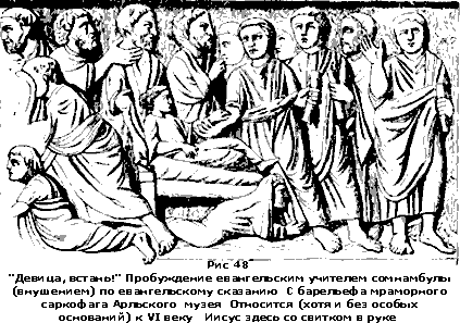 В своей юности он получил, как будет показано далее, в центре культуры первых веков нашей эры — Египте — высшее по тому времени образование. Как видно из всех Евангелий, он знал и магию (рис. 47), и алхимию, и искусство лечить нервных больных посредством внушения (рис. 48), и сверх всего этого был еще, повидимому, и талантливым зодчим. И не без основания евангелист Иоанн мог вложить в его уста такую гордую фразу: