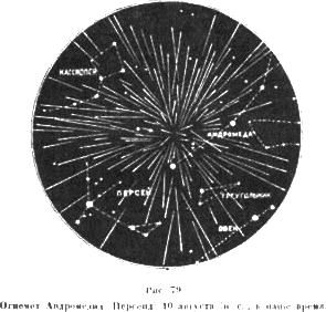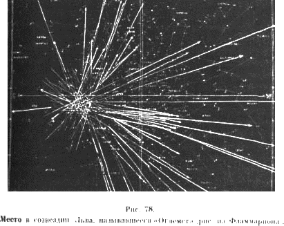 Обратившись к астрономии, мы легко определим его. Это — пункт в созвездии Льва, около его шеи, под которым Солнце ежегодно проходит в августе, и откуда через каждые 34 года вырывались около 13 — 14 ноября (нового стиля и по звездному году) необычно сильные, самые сильные из всех, рои летучих звездочек. Это были поразительные явления: созвездие Льва бросало от себя ежеминутно в продолжение 5 часов во все стороны десятки тысяч огненных копий (рис. 78).