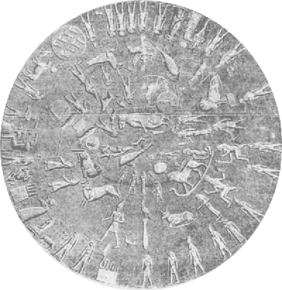 Рис. 89. Круглый потолок Дендерского храма в Египте. Среди фигур, изображающих жертвенные процессии, даны 12 созвездий Зодиака и представлены планеты: Марс на Козероге, Сатурн под Девой, Юпитер у Рака над Львом, Венера под Овном, Солнце и Меркурий в Рыбах.