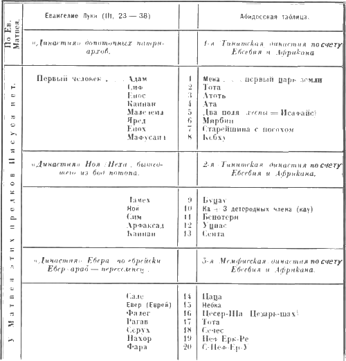 Взгляните далее на таблицу XIX. Посредине ее дана (числами 1, 2, 3 и т. д.) последовательность имен 76 предков Иисуса, перечисленных в Евангелии Луки (левая сторона таблицы) и параллельно ей (на правой стороне) приведена последовательность 76 предков Ра-Мессу Великого на Абидосской стенной таблице, кончающейся «Владычицей правды», матерью Ра-Мессу (см. табл. XXVIII в конце книги). Неодинаковый звуковой состав имен в Евангелии Луки и в иероглифах Абидоса не должен нас смущать. Эти имена даже и в египтологии называются «коронационными», т.е. носимыми со времени коронации в Египте, и все они представляют лишь местные прозвища или титулы. А в евангельской параллели даны арабско-еврейские прозвища тех же лиц, имеющие смысл лишь на еврейском языке.