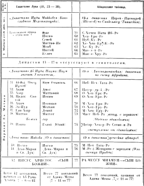 VII. До сих пор мы пользовались для объяснения евангельской родословной Иисуса Абидосским списком, а вот теперь нам приходится делать обратное: разъяснять самую Абидосскую таблицу посредством Евангелия.