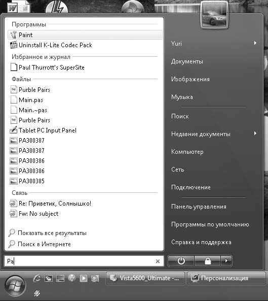 Одна из главных функций Windows Vista, с которой следует познакомиться в первую очередь, – это встроенная система поиска. Теперь для запуска программ и открытия документов не нужно открывать многоуровневые меню или добираться до нужного значка, последовательно открывая несколько папок. С помощью строки поиска в меню Пуск это можно сделать значительно быстрее.