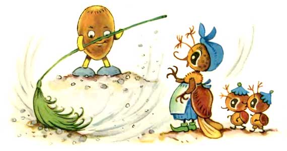 — Я тоже хочу мести! — кричит Желудёк и отнимает у жука метлу. — Я лучше умею!