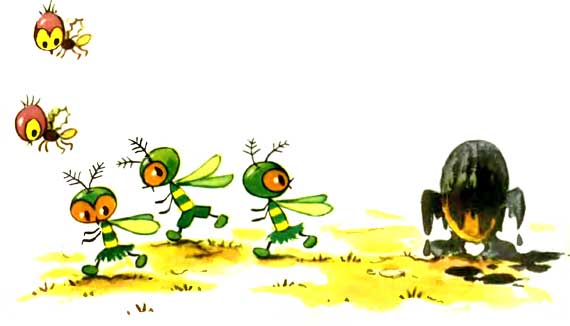 Но по пути человечек начинает раздумывать: «Чего ради мне тащиться в такую даль? Жужелица и сама может сбегать. Я лучше отдохну».