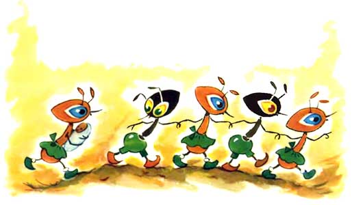 По тропинке один за другим засменили жители городка. Жуки тащили коробочки, полные семян, крот — коренья, мышка несла колосок, а мошки катили крошечный гриб-споровик. Все торопились на большую осеннюю ярмарку.