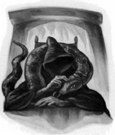 Позади говорившего был камин, поэтому прибывшие поначалу не могли разглядеть ничего, кроме его силуэта. Но когда они приблизились, перед ними возникло безволосое, похожее на змеиное, лицо со щелями вместо ноздрей и горящими красными глазами с вертикальными зрачками. Он был настолько бледен, что, казалось, излучал жемчужное сияние.