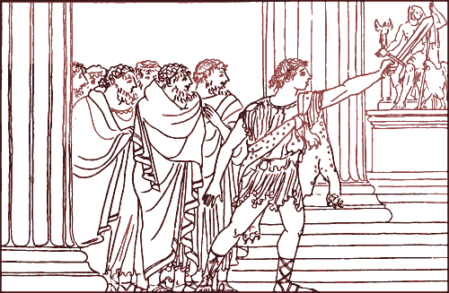 Услыхав такой ответ от человека, которого он считал своим врагом, Язон удивился и обрадовался: он ещё не знал, как коварны бывают люди. Приветливо улыбнувшись хитрому горбуну, он направился туда, куда его повели жители Иолка, и весёлые иолкские мальчишки с шумом побежали впереди толпы, чтобы посмотреть, чем кончится дело.
