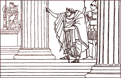 Другие же мальчуганы повисли на запятках царской колесницы и, как ни отгоняла их стража, ехали так до самого дворца. Они видели, каким мрачным было чело царя, какие тяжёлые морщины лежали у него над бровями, каким жестоким лукавством горел его взгляд, когда, сойдя с золочёной колесницы, горбун всходил по мраморным ступеням.
