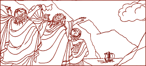 И, обратившись к смелым воинам, он сказал, что по желанию богов надо отплывать в путь завтра, чуть забрезжит утренний свет.