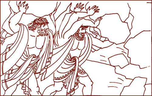 Утром в тумане «Арго» уже отплывал от гостеприимного берега. Но не успел ещё Тифий в первый раз налечь на верное кормило, как вдруг на ближнем мысу послышался дикий рёв: разводя одними руками верхушки деревьев, подхватывая другими целые скалы с земли, бежали по склону горы вниз многорукие чудовища. Со злобными воплями они начали метать обломки камней в море, стремясь закрыть ими выход из бухты. И «Арго» повернул назад к земле.