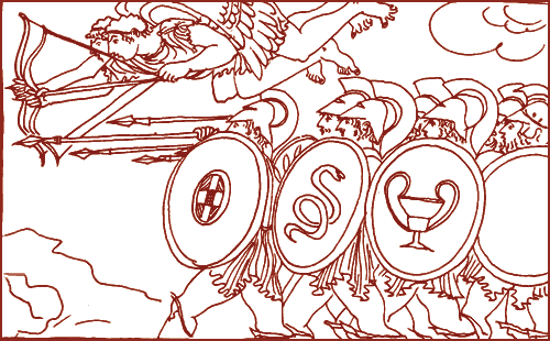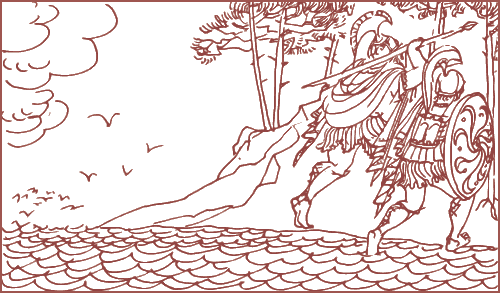 Тотчас же поднялся над склонёнными к вёслам гребцами могучий Геракл. Схватив свой верный лук, он осыпал шестируких дождём метких стрел. С воплями упали некоторые из них на прибрежный песок, когда, издав победный клич, аргонавты спрыгнули на берег.