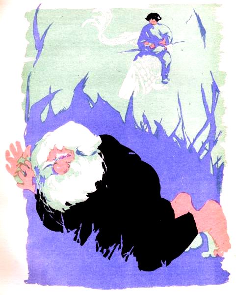 Ринулся Черный Всадник на парня, и закипел на вершине горы страшный бой. Только недолго тот бой длился — выбрал Ванюша минутку, поднял тугой лук, натянул тетиву и пустил стрелу в Черного Всадника.