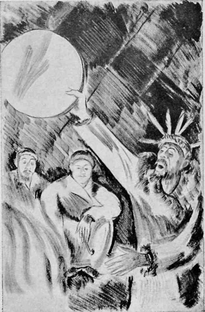 Съехались гости, и вечером в аиле ярко запылал костер; направо садились женщины, налево мужчины, ближе к огню расположились ребятишки. Над огнем сушили бубен, а шаман, безучастно чавкая землистыми щеками, сосал трубку. Сохла кожа на бубне. Звуки крепче и звонче. Кривоногая старуха подбросила в огонь смолевых щеп. Вспыхнуло пламя. Прекратились шутки и смех. Вытянулись торжественно лица. Ребятишки припали к костру.