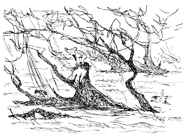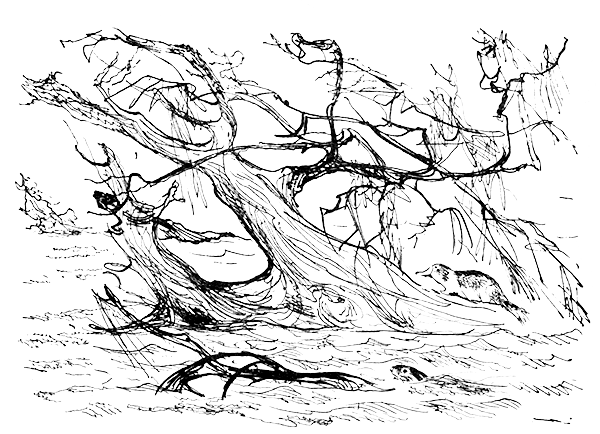 Впереди Тихоня увидела большое дерево. Его корни ещё цеплялись за берег, но ствол и ветви уже содрогались под натиском воды. Тихоня попыталась приблизиться к нему, изо всех сил загребая передними лапами и выруливая хвостом. Кто-то сильно толкнул её. Фу! Это была большая водяная крыса. Тихоня отпихнула её и попыталась схватиться за ветви дерева когтями и клювом. После второй попытки это ей удалось. Она устроилась поудобней между ветвями и вздохнула спокойней. И тут же дерево оторвалось от берега и поплыло по течению.