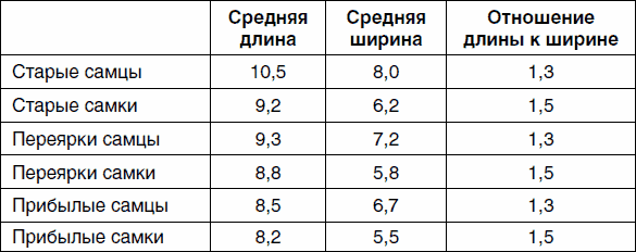 Из таблицы видно, что у самцов всех возрастных групп отношение длины «следа» к его ширине равно 1,3, а у самок – 1,5.