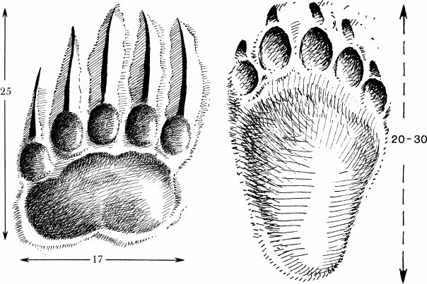 Рис. 13. Отпечаток передней лапы бурого медведя (справа) на грязи дороги (сильно ум.). Когти прорезали глубокие длинные борозды. Харовский р-н, Вологодск. обл., апрель 1951 г.