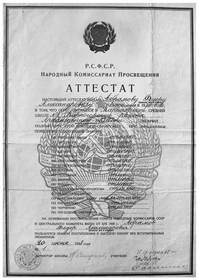 Аттестат Фёдора Абрамова, выданный после окончания Карпогорской средней школы. 1938 г. Публикуется впервые